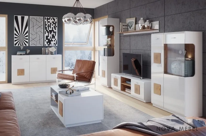 - Подсветка: Светодиодная подсветка (LED) эффектно подчёркивает контуры мебели, выделяет ниши и расположенные на полках украшения, создавая уютную и современную атмосферу.